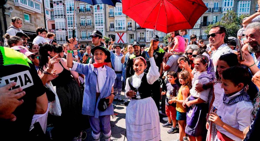 La Blanca 2022 ha dedicado esta jornada a los más pequeños que por la tarde encabezaron los paseíllos de las cuadrillas de neskas y blusas, tanto en el de ida como en el de vuelta. A primera hora de la mañana realizaron una ofrenda floral ante la hornacina de la Virgen Blanca donde también bailaron el tradicional aurresku de honor.