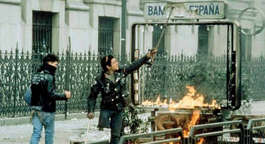 ​Jon Manteca, contagiado por lo violento del ambiente, según explicaría más tarde, utilizó una de las muletas en las que se apoyaba al caminar para romper el letrero de la estación de metro de Banco de España y un reloj−termómetro frente al Banco de España, y en esa actitud fue captado por las cámaras de la Agencia EFE. Algo muy comentado por algunos manifestantes, y no por la prensa, era el asombro que causaba la extraordinaria velocidad a la que se desplazaba, con solo una pierna y las muletas, para huir de las cargas policiales.