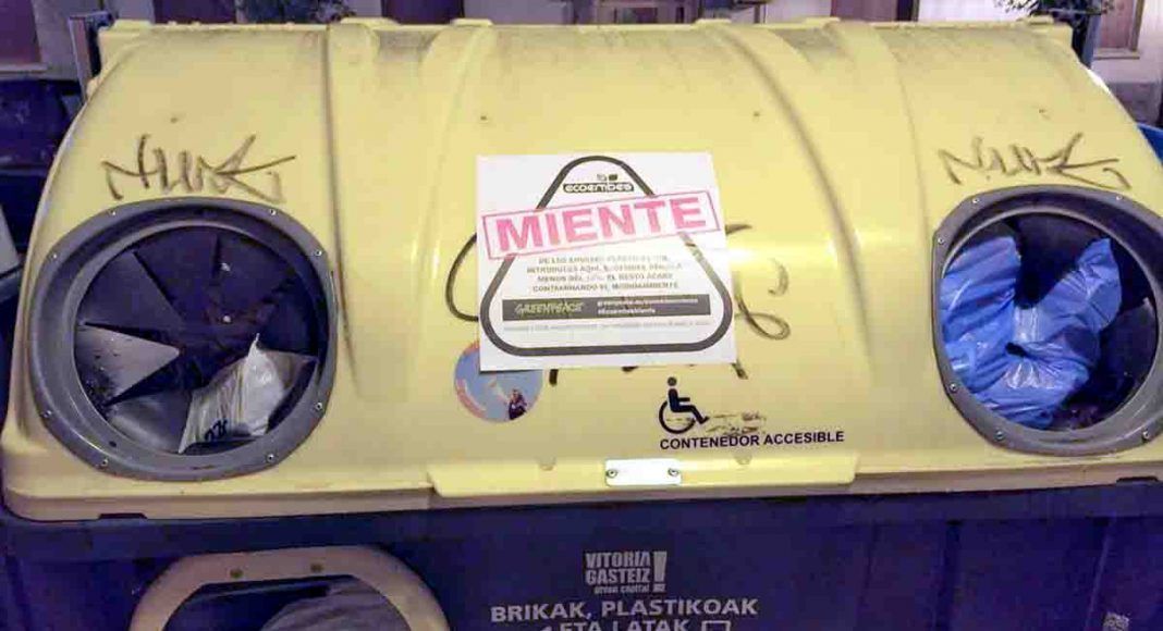 No obstante, Greenpeace ha estado durante meses desmontando a través de estudios, informes y documentos las afirmaciones de Ecoembes, que se presenta como una entidad protectora del medio ambiente, mientras según Greenpeace es la principal entidad que está frenando la puesta en marcha de una Ley de Gestión de Residuos verdaderamente eficaz y basada en la protección del medioambiente y las personas. Para denunciar esta situación, el grupo de voluntariado de Greenpeace realizó una actividad de denuncia, que consistía en colocar pegatinas en contenedores de reciclaje con la frase “Ecoembes miente”. Ante esto, el Ayuntamiento de Vitoria-Gasteiz decidido multar con 751 euros a la organización.