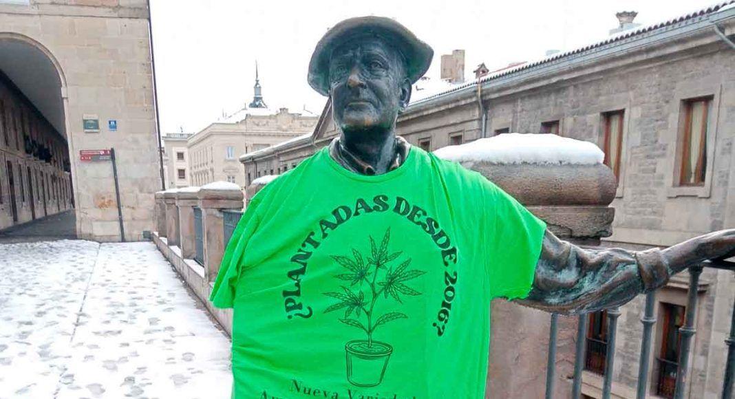 Celedón y Ken Follet vestidos de verde en San Canuto para exigir al Gobierno Vasco que regule los clubes sociales de cannabis