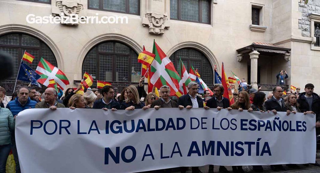 Este domingo, la Plaza Celedones de Oros en Vitoria-Gasteiz fue el escenario de una concentración convocada por el Partido Popular (PP), que también contó la presencia de VOX, en contra de la futura Ley de amnistía que se prevé impulsar por el gobierno de Sánchez. Los presentes en la manifestación, que contó con la presencia de destacados miembros del PP y de VOX en Euskadi, exigieron «la igualdad de los españoles» y expresaron su rechazo a la amnistía.