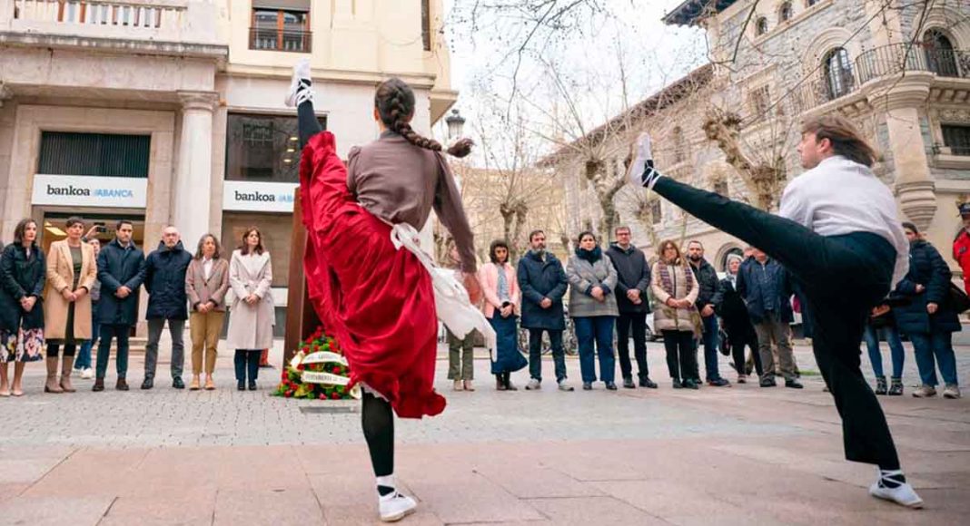 Autoridades y representantes de diversas instituciones han participado en la ofrenda floral ante la escultura ‘Isiltasunean Oihuka’
