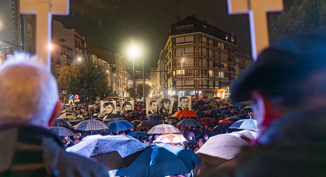 Una kaixarranka sobre una kutxa portada en alto, la voz de Jon Maia quebrando el silencio, los irrintzis, las bengalas ardiendo junto a los rostros de los asesinados y una plaza que no se vació hasta el final: Vitoria-Gasteiz ha vivido una conmemoración que ha quedado grabada en la memoria de la ciudad