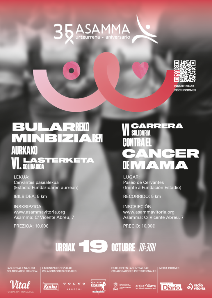 Vitoria-Gasteiz acogerá este domingo 19 de octubre una nueva edición de la Carrera Solidaria contra el Cáncer de Mama, organizada por la asociación ASAMMA. La cita arrancará a las 10:30 de la mañana en el Paseo de Cervantes, y está abierta a todos los públicos.