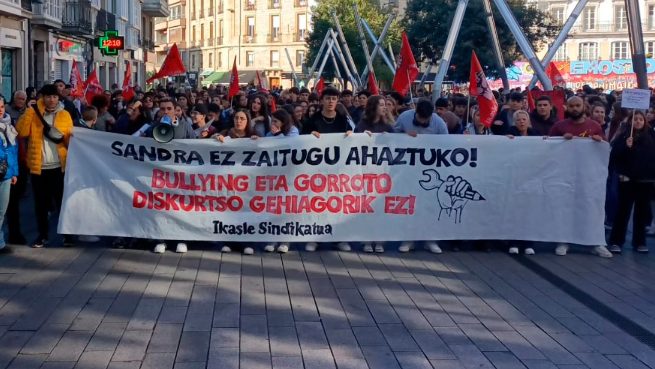 Este lunes 28 de octubre, un grupo de estudiantes se ha concentrado en Vitoria-Gasteiz para decir basta al acoso escolar. La protesta ha sido parte de una huelga convocada en todo el Estado tras la muerte de Sandra Peña, una joven de 14 años que se suicidó después de sufrir bullying en su colegio, Irlandesas de Loreto, en Sevilla.