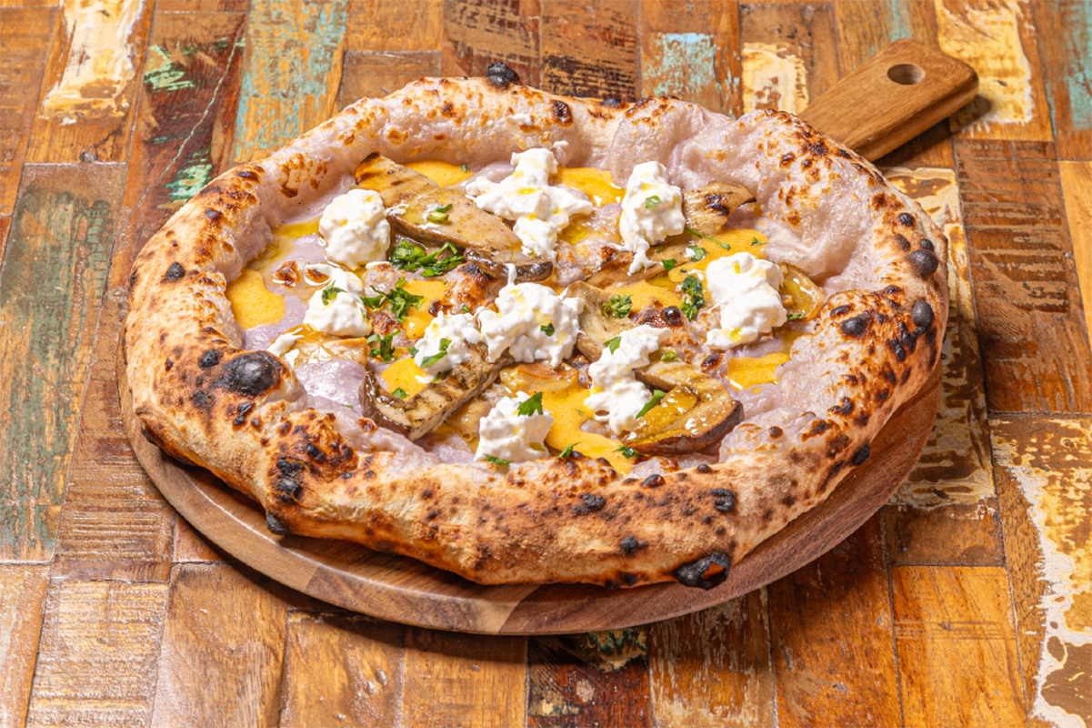 La receta se completa con burrata ahumada de la región italiana de Puglia, carbocrema —una emulsión de yema de huevo y pecorino romano—, perejil y aceite de oliva virgen extra ecológico de origen navarro. Todo ello sobre una masa elaborada a mano y fermentada durante 24 horas con harinas nacionales. Una «euskalpizza», como la definen sus creadores, que no renuncia a la esencia italiana.