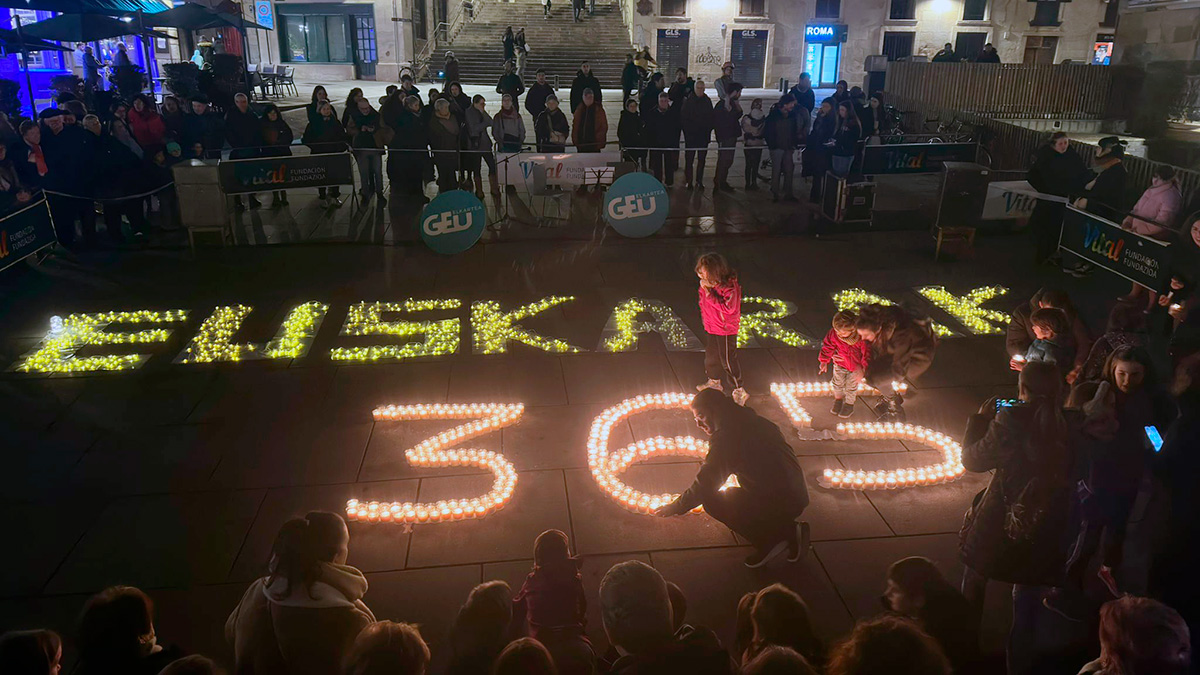Gasteizek Euskararen Nazioarteko Eguna ospatu du gaur, egun osoan zehar antolatutako jarduerekin. Une bereziena iluntzean izan da, Andre Maria Zuriaren plazan ospatutako ekitaldian. Bertan, kandelek “euzkaraz 365 egun” mezua osatu dute, euskararen aldeko konpromisoa irudikatzeko.