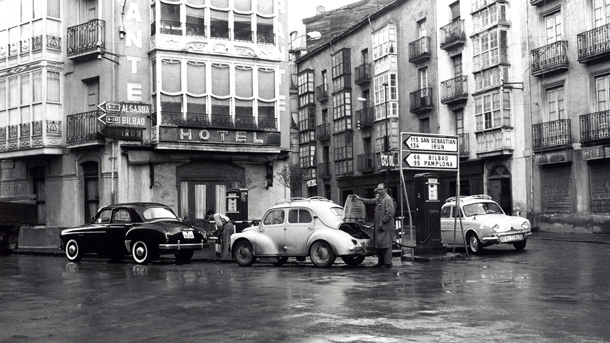 En la fotografía se aprecian varios vehículos de la época, personas repostando manualmente y un entorno urbano tranquilo, con calzadas mojadas y escaso tráfico. Al fondo, un edificio con el rótulo de hotel y señales de carretera que indican distancias a ciudades como Bilbao, San Sebastián, Irun o Pamplona, refuerzan la idea de Vitoria-Gasteiz como nudo de comunicaciones.