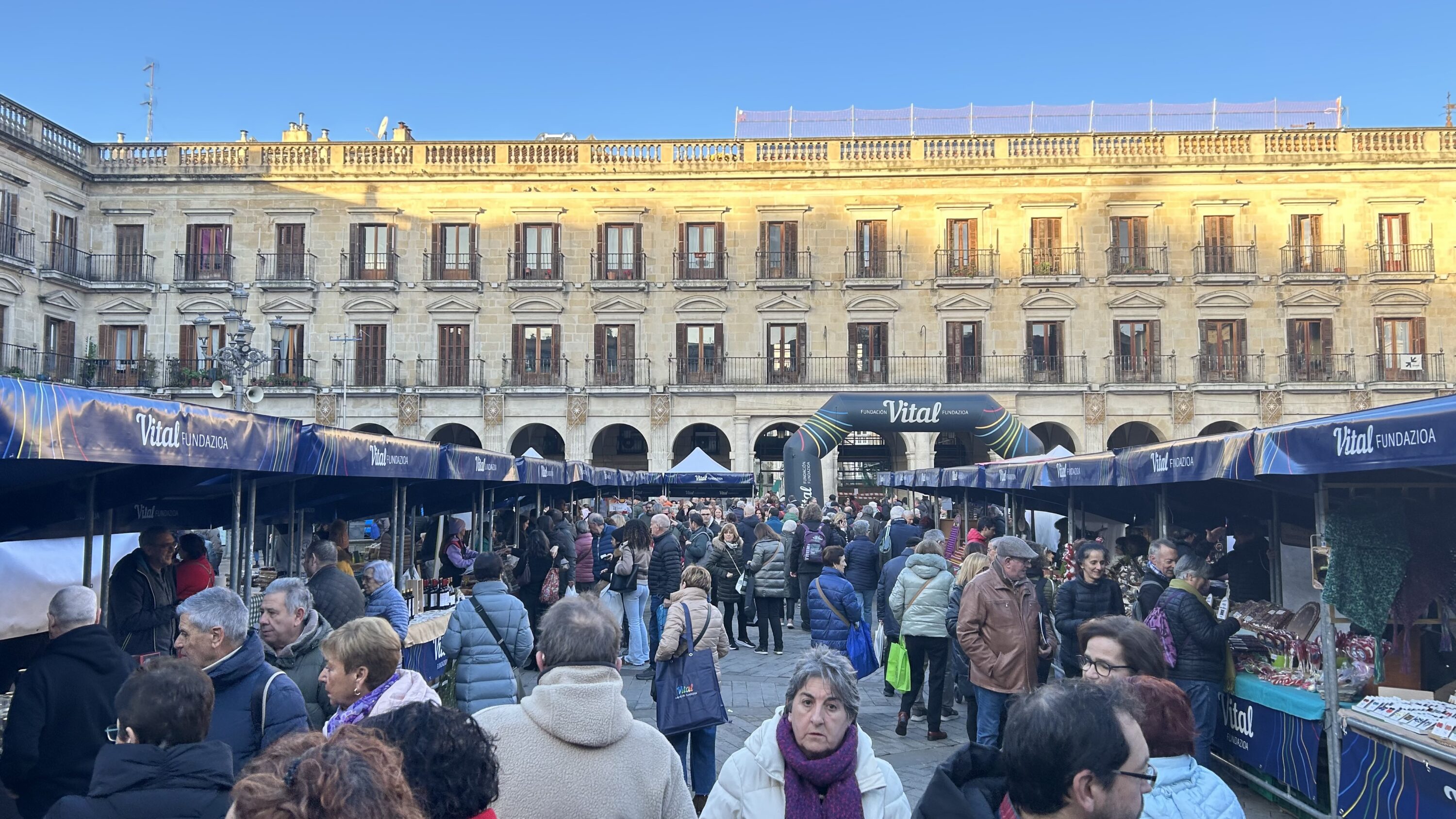 Desde primera hora de la mañana, la Plaza Nueva de Vitoria-Gasteiz se ha transformado en un gran mercado al aire libre. El Mercado de Navidad de Fundación Vital ha abierto hoy sus puertas, como cada jueves anterior a Nochebuena, y desde bien temprano cientos de personas han comenzado a recorrer los 97 puestos llenos de productos típicos, regalos artesanales y sabores locales. La actividad no ha parado de crecer a medida que avanzaba la mañana, en un ambiente festivo que anticipa la llegada de la Navidad.