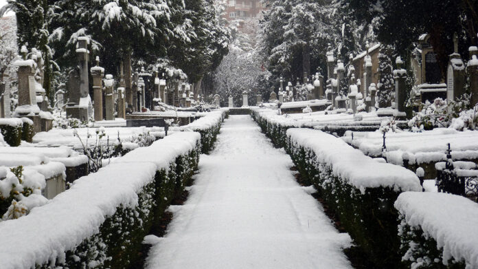 En el camposanto, la escena ha quedado congelada —literalmente— en un paisaje silencioso y cubierto por una capa espesa de nieve. El camino central del cementerio se ha transformado en un pasillo blanco que se pierde a lo lejos, flanqueado por setos perfectamente recortados y tumbas con lápidas y cruces, todo con una capa uniforme de nieve.