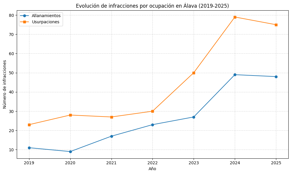 En el conjunto de la Comunidad Autónoma, la Ertzaintza registró 467 infracciones por usurpación y 299 por allanamiento de morada, domicilios de personas jurídicas o establecimientos, según consta en el balance anual elaborado por la Dirección de Coordinación de Seguridad del Gobierno Vasco. Dentro del bloque de usurpación, la gran mayoría de los casos se corresponden con ocupaciones no violentas de inmuebles ajenos que no constituyen morada.