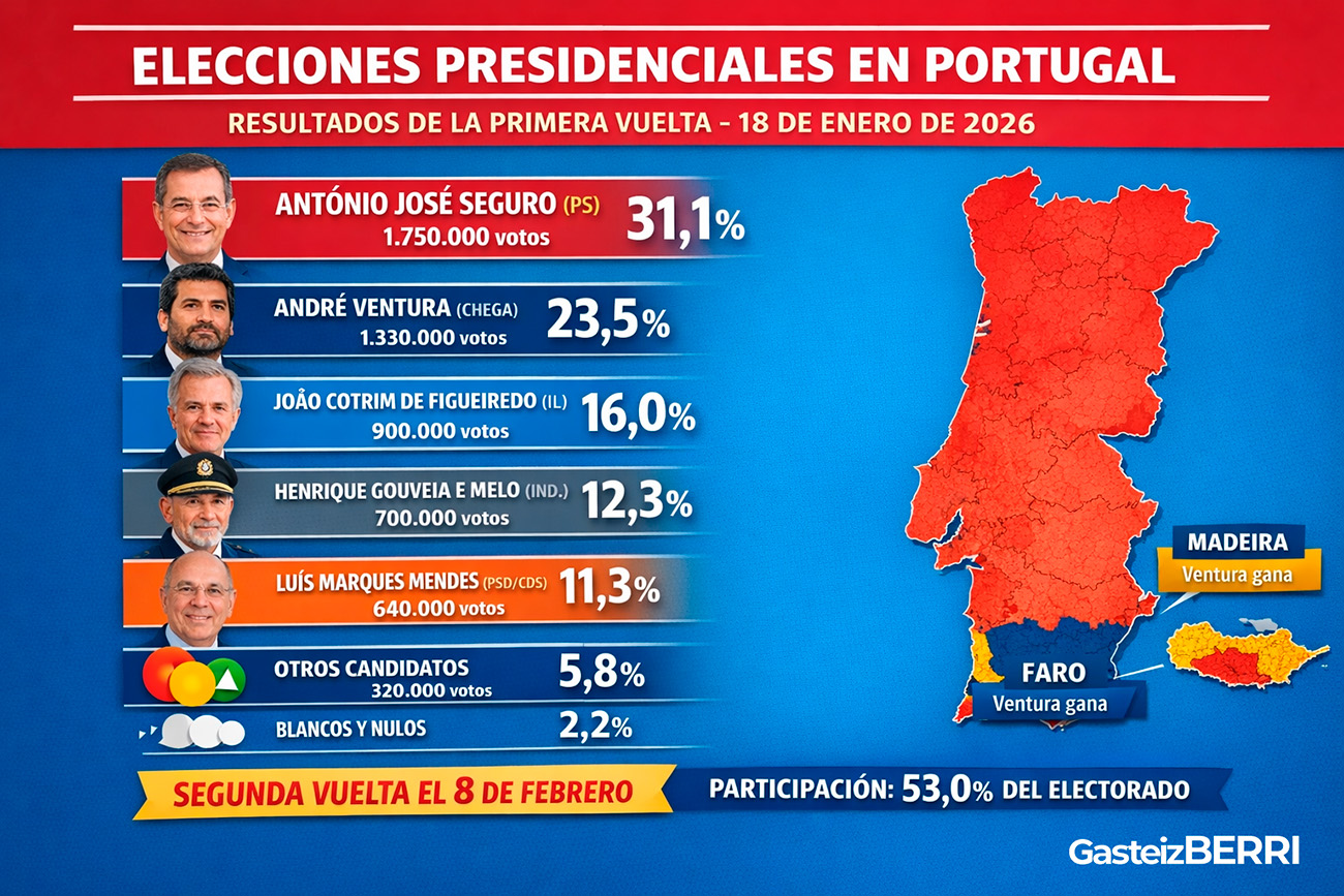 António José Seguro ha sido el candidato más votado en la primera vuelta de las elecciones presidenciales de Portugal celebradas ayer domingo 18 de enero, con un 31,1% de los votos (aproximadamente 1,75 millones), seguido por André Ventura (23,5%, 1,33 millones), según datos oficiales del Ministerio del Interior de Portugal. Ninguno ha alcanzado la mayoría absoluta exigida por la Constitución, por lo que la segunda vuelta queda fijada para el 8 de febrero de 2026, con ambos candidatos como finalistas.