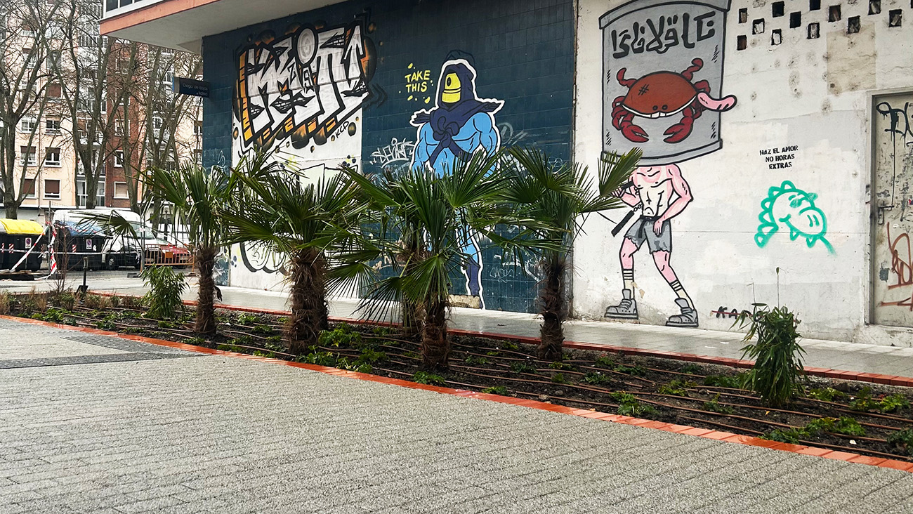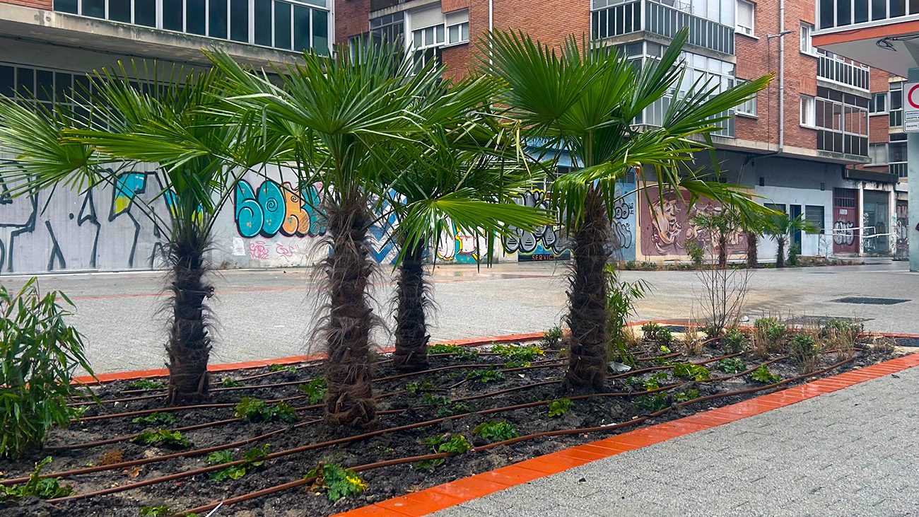 La intervención municipal ha eliminado por completo el aparcamiento en superficie para dar paso a una zona peatonal con parterres de gran tamaño, vegetación ornamental y una selección de plantas de aire tropical. La imagen renovada de la calle tiene como principal seña de identidad la presencia de varias palmeras ya plantadas, que aportan un carácter inédito al paisaje urbano del barrio.