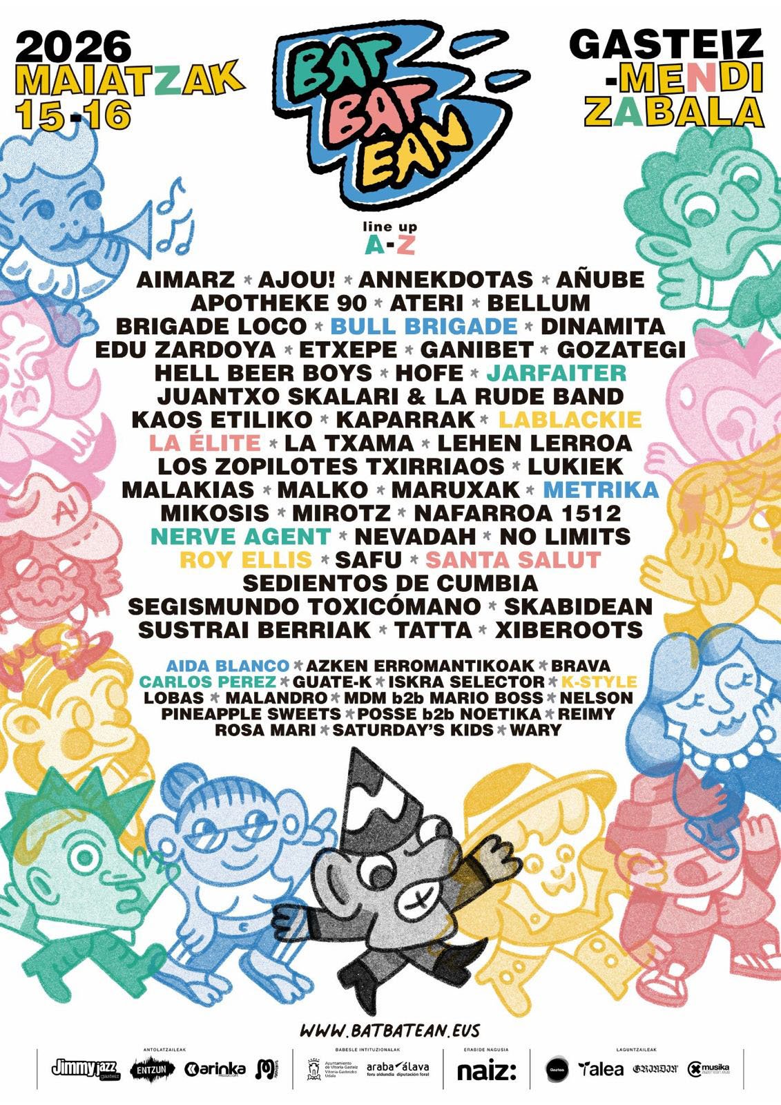 El listado de artistas confirma la apuesta de BATBATEAN por un cartel diverso y sin jerarquías artificiales. Entre los nombres más reconocibles figuran Juantxo Skalari & La Rude Band, Segismundo Toxicómano, Brigade Loco, Santa Salut, Los Zopilotes Txirriaos o Roy Ellis, referente internacional del skinhead reggae. La representación vasca es amplia, con bandas como Kaparrak, Lehen Lerroa, Annekdotas, Sustrai Berriak, Nafarroa 1512, Etxepe, Mirotz, Lukiek o Gozategi, entre muchas otras.