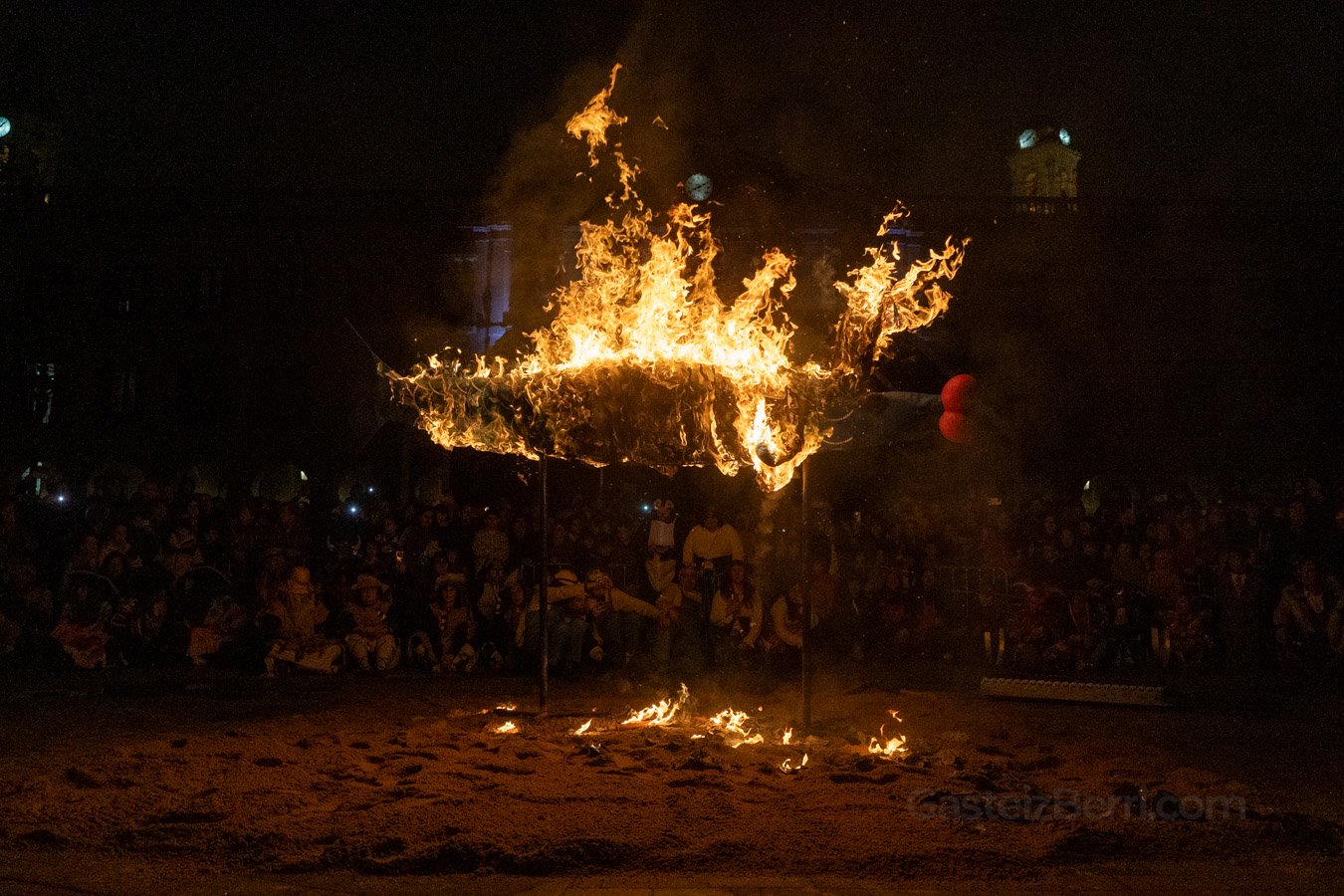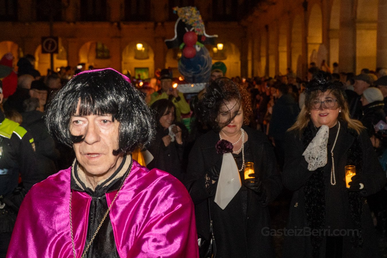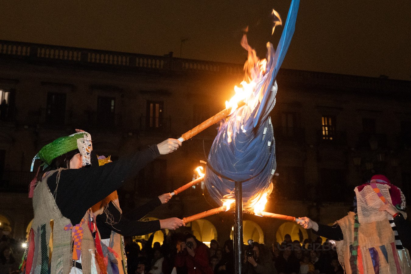 Después comenzó el cortejo al son de una marcha fúnebre. Portada a hombros por llorones y plañideras, la sardina recorrió la Plaza Nueva seguida por comparsas y decenas de personas disfrazadas. Poco a poco, la atención se fue concentrando en el centro de la plaza, donde aguardaba la hoguera.