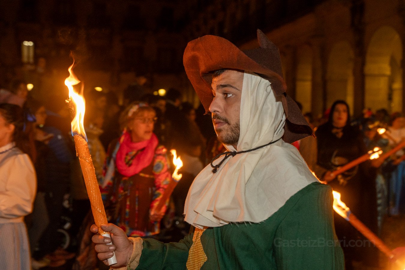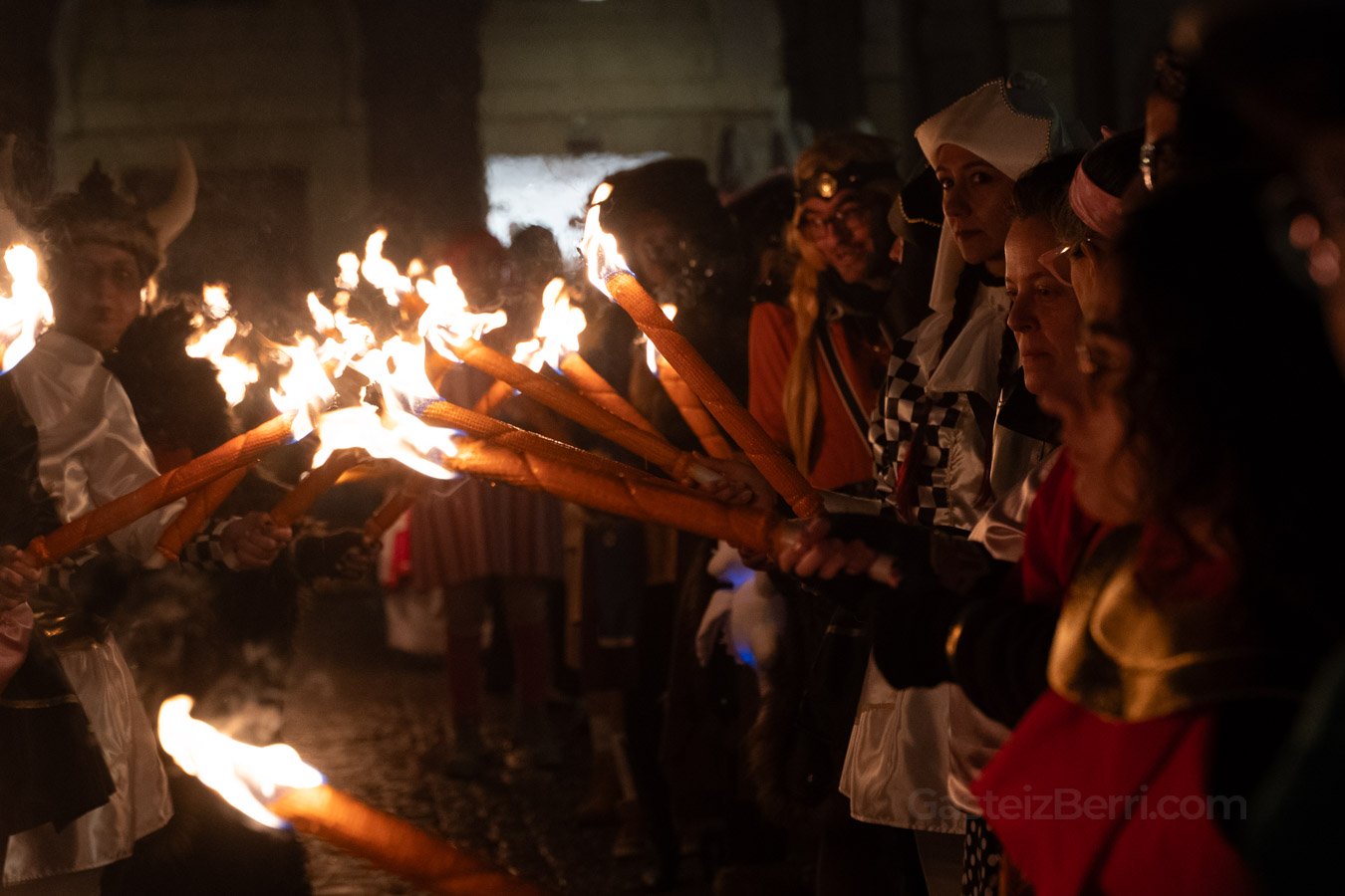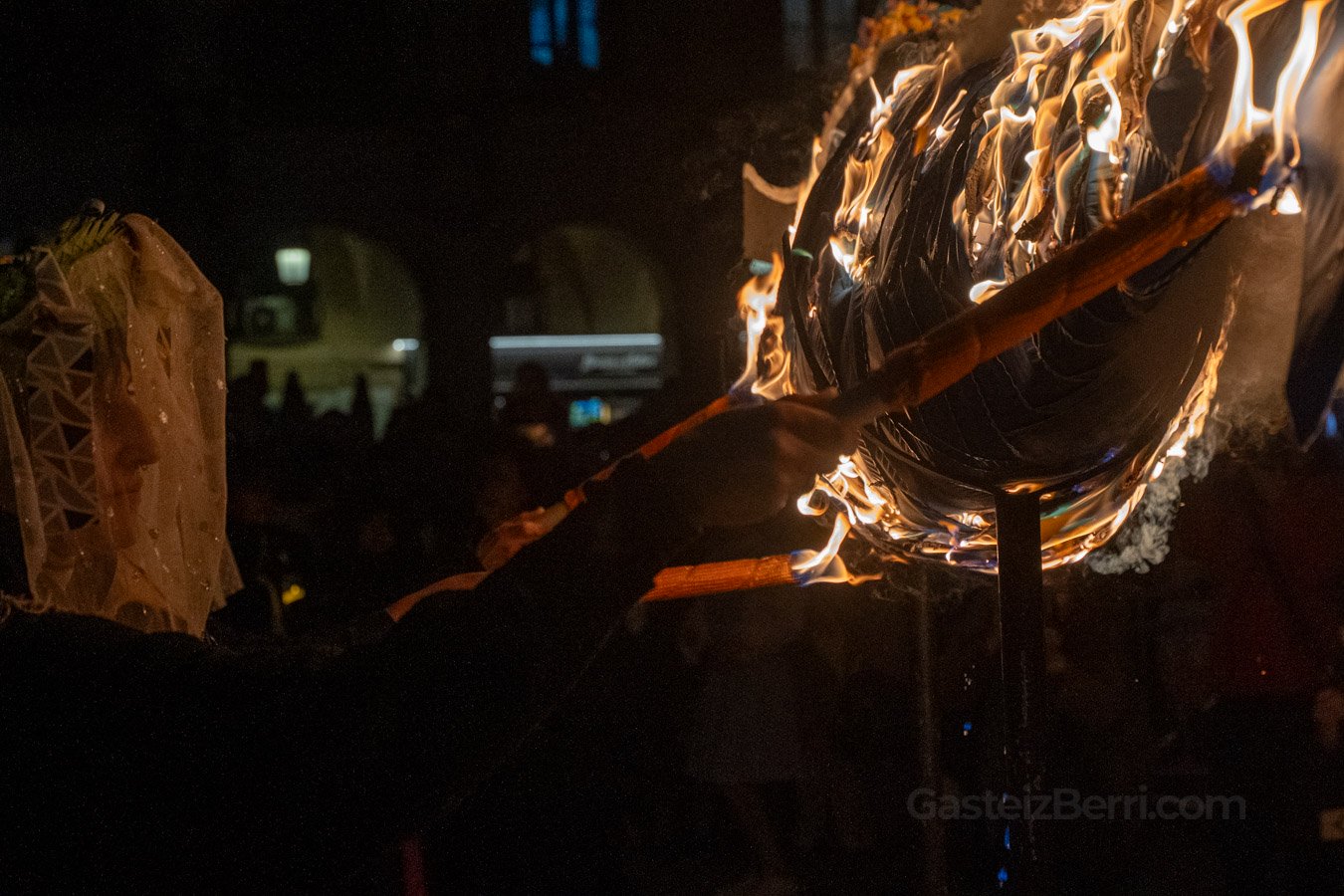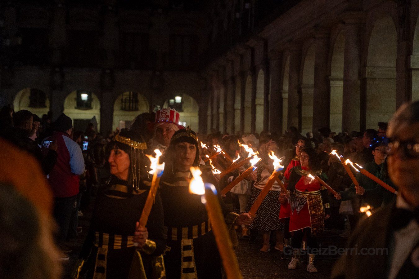 Después comenzó el cortejo al son de una marcha fúnebre. Portada a hombros por llorones y plañideras, la sardina recorrió la Plaza Nueva seguida por comparsas y decenas de personas disfrazadas. Poco a poco, la atención se fue concentrando en el centro de la plaza, donde aguardaba la hoguera.