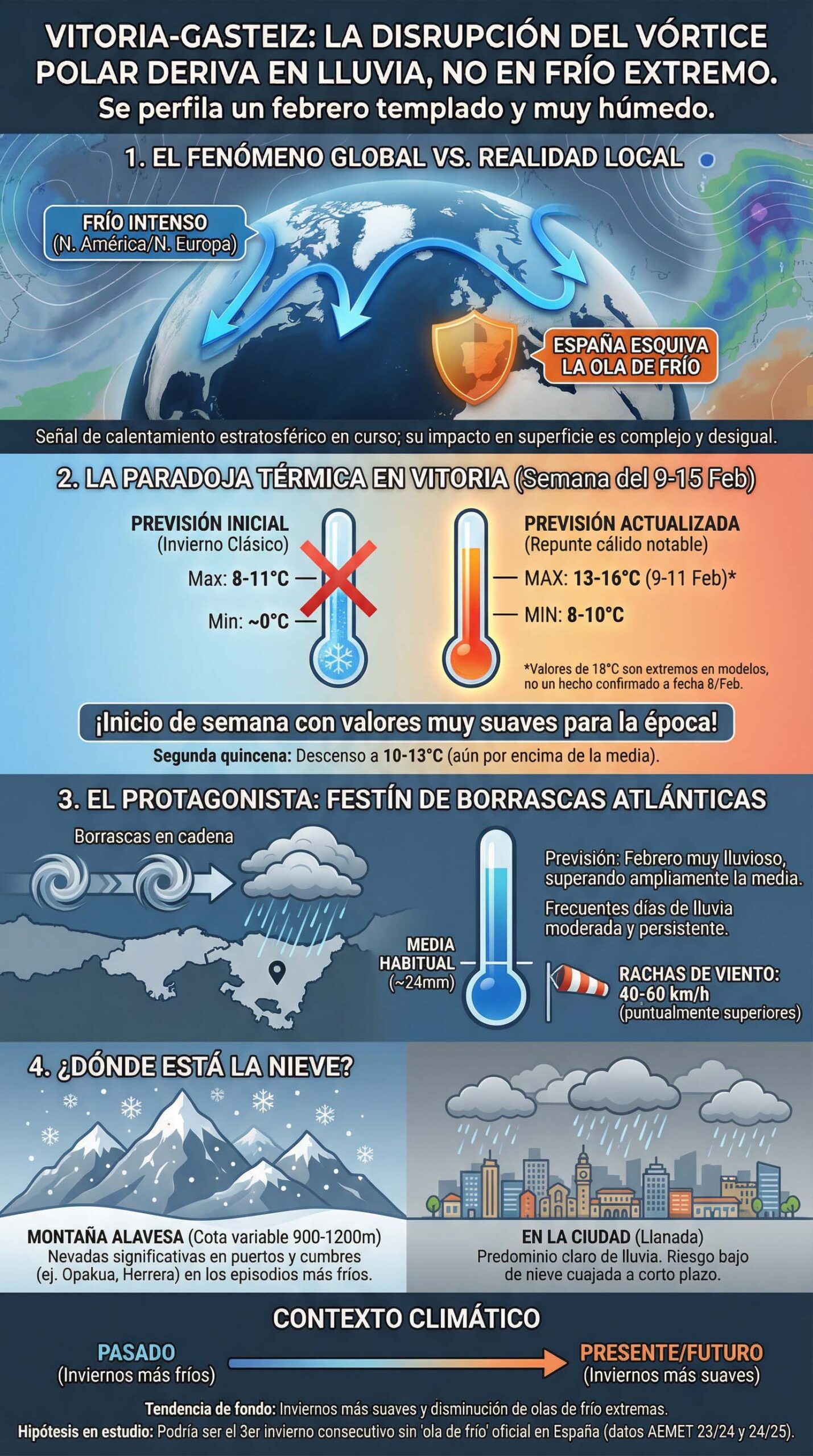«En Vitoria-Gasteiz se perfila un febrero muy invernal en cuanto a lluvia y cielo gris, pero con una primera mitad sorprendentemente suave en temperaturas», resume eltiempo.es. «El motor estratosférico está ahí, pero la traducción en superficie es más lluvia y viento que frío extremo», concluyen desde Severe Weather Europe.