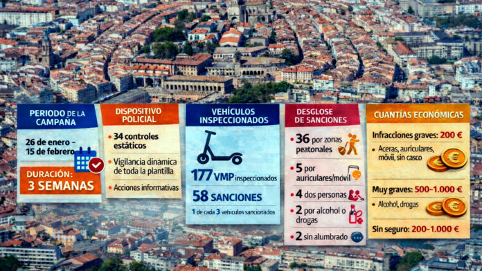 La Policía Local de Vitoria-Gasteiz ha impuesto 58 sanciones administrativas durante la primera campaña específica de control de vehículos de movilidad personal (VMP), desarrollada entre el 26 de enero y el 15 de febrero. En total se han realizado 34 controles estáticos y se han inspeccionado 177 patinetes eléctricos. Uno de cada tres vehículos controlados ha sido sancionado .