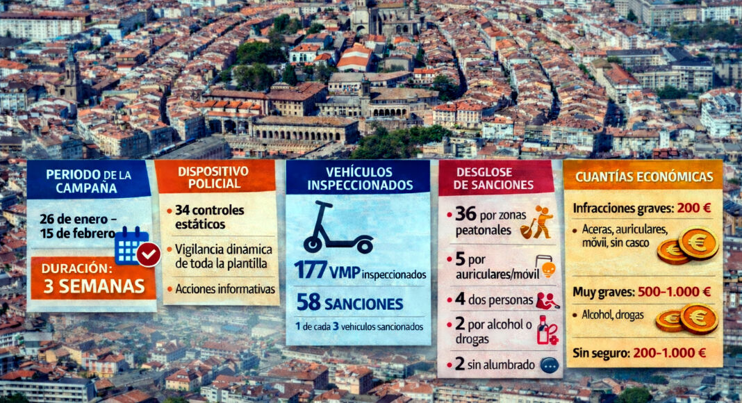 La Policía Local de Vitoria-Gasteiz ha impuesto 58 sanciones administrativas durante la primera campaña específica de control de vehículos de movilidad personal (VMP), desarrollada entre el 26 de enero y el 15 de febrero. En total se han realizado 34 controles estáticos y se han inspeccionado 177 patinetes eléctricos. Uno de cada tres vehículos controlados ha sido sancionado .
