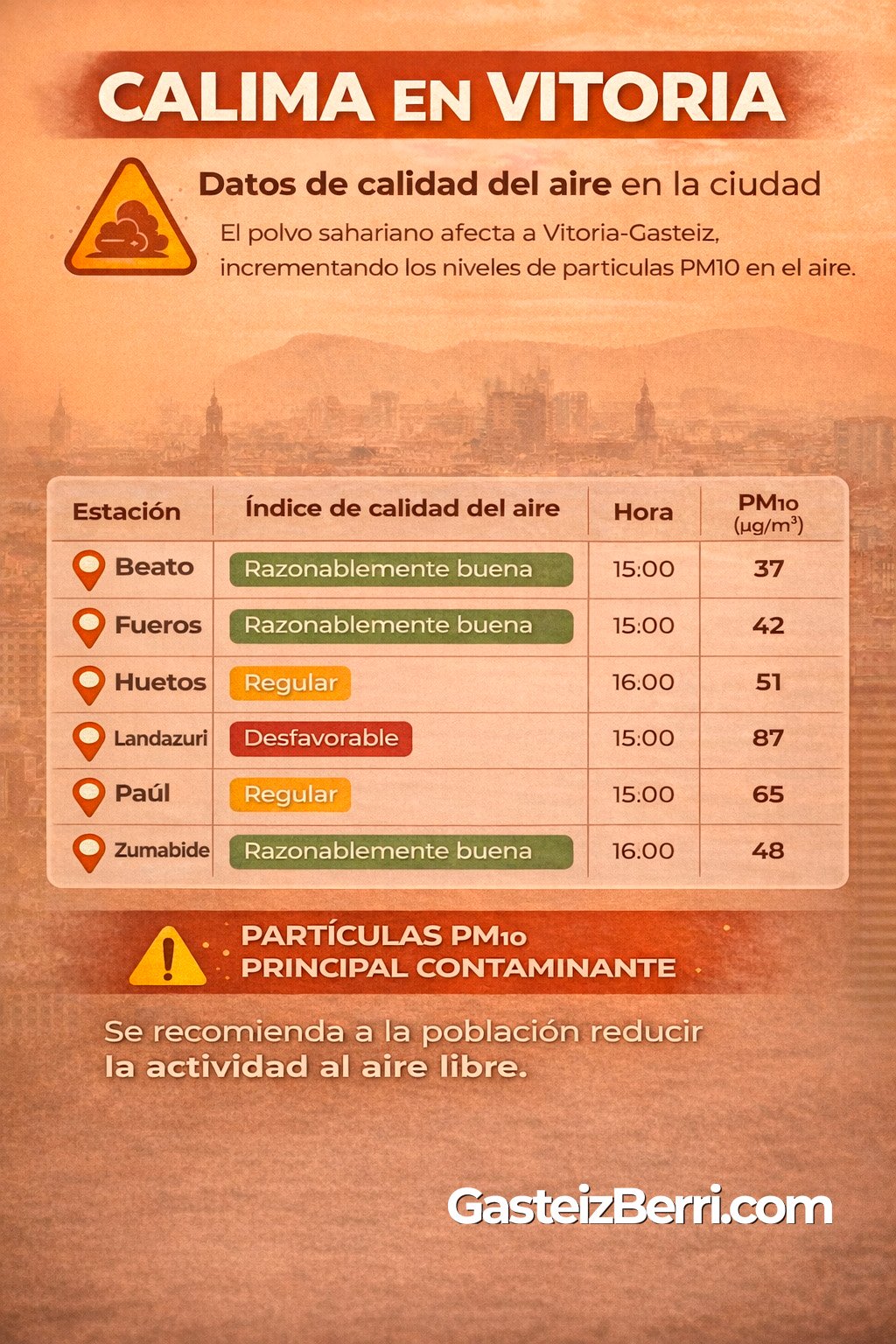 La intrusión de polvo sahariano que afecta estos días a gran parte de la península también está dejando efectos en Vitoria-Gasteiz, donde el Ayuntamiento ha advertido de un aumento generalizado de partículas en el aire. El episodio está relacionado con una masa de polvo procedente del norte de África y se prevé que se mantenga al menos hasta la noche de este jueves, 5 de marzo.