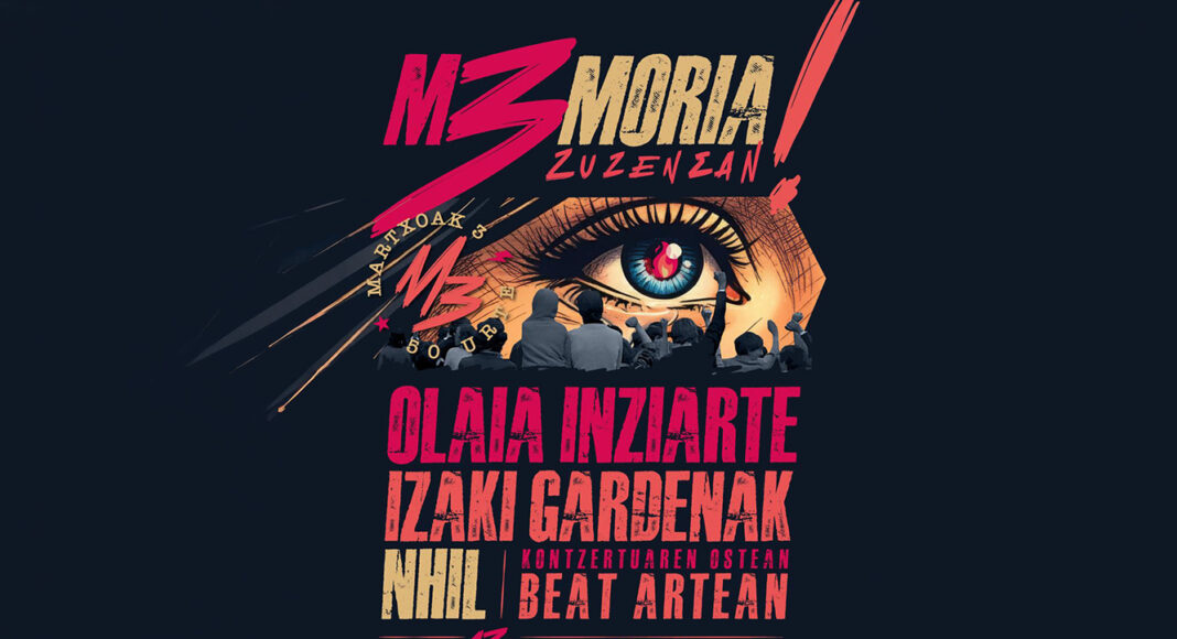 La sala Jimmy Jazz de Vitoria-Gasteiz acoge este viernes 13 de marzo el concierto «M3moria Zuzenean», un evento enmarcado en la programación del 50 aniversario de la masacre del 3 de marzo de 1976. Organizado por Martxoak 3 Elkartea, el cartel reúne a tres propuestas musicales en euskera: Olaia Inziarte, Izaki Gardenak y Nhil. Las puertas se abrirán a las ocho de la tarde y todavía quedan algunas entradas a la venta.