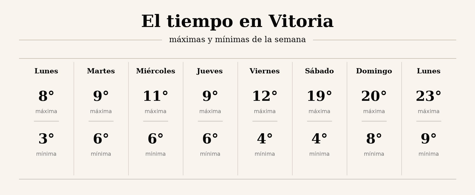El contraste se verá especialmente entre el inicio y el final de la semana. Este lunes, el tiempo en Vitoria se queda en solo 8 grados de máxima y 3 de mínima. El martes apenas habrá cambios, con 9 y 6 grados, y el miércoles se espera un pequeño repunte hasta los 11 grados, aunque el ambiente seguirá siendo frío.