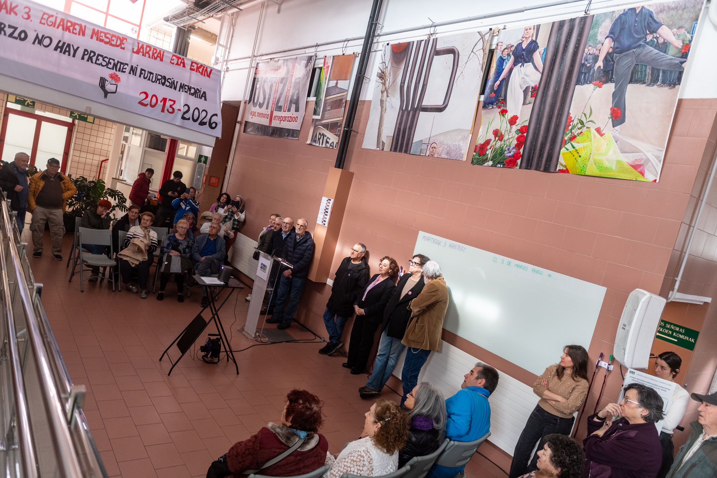 Durante esta semana, una pancarta con el lema en euskera y castellano sobre la memoria del 3 de marzo da la bienvenida a quienes acceden al edificio. En la apertura han estado presentes integrantes de la asociación Martxoak 3, el grupo motor del Plan Zaramaga, el BIZAN y la red de salud del barrio, entre otros colectivos vinculados a la conmemoración.
