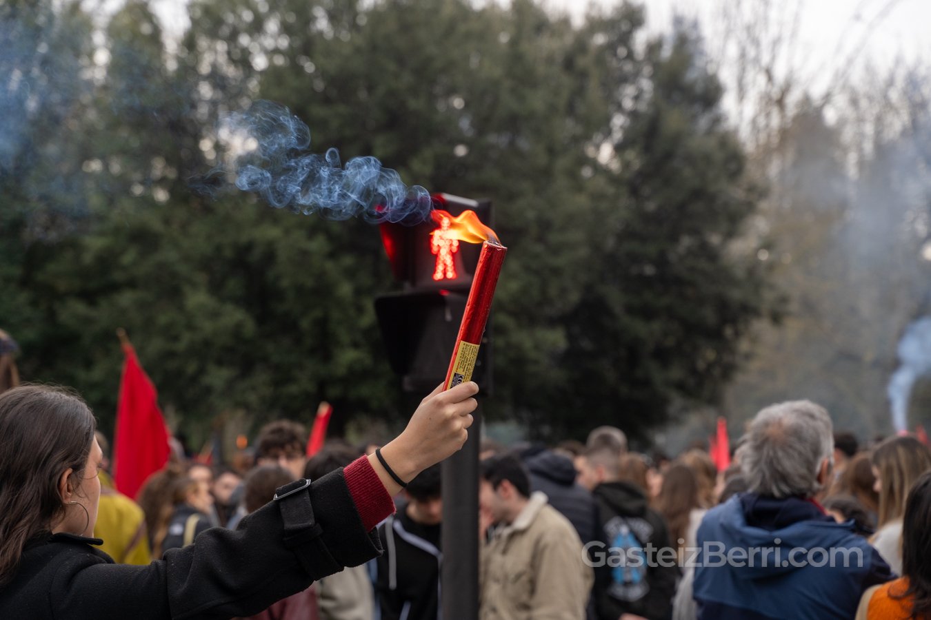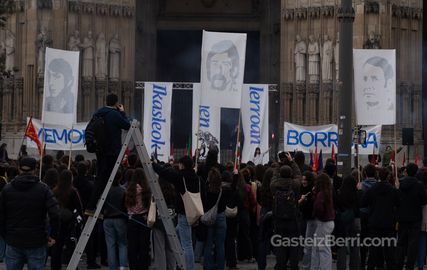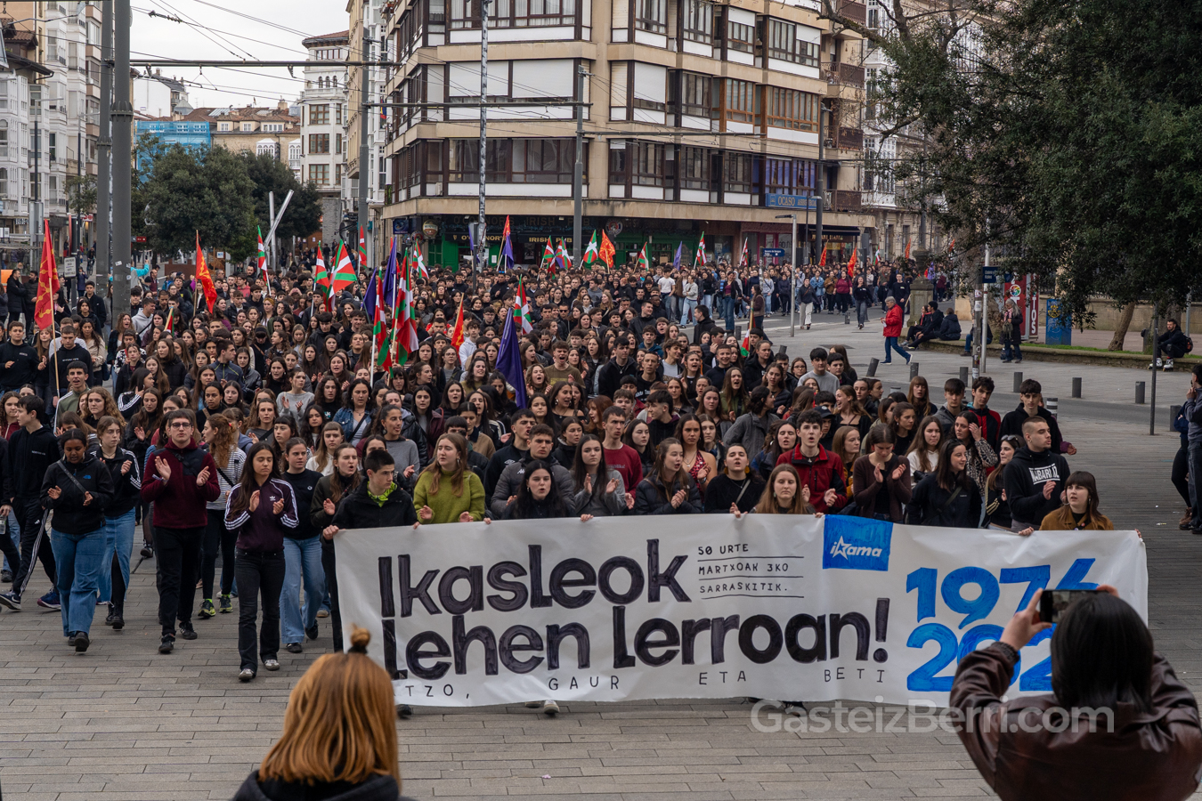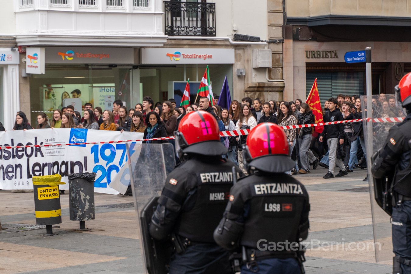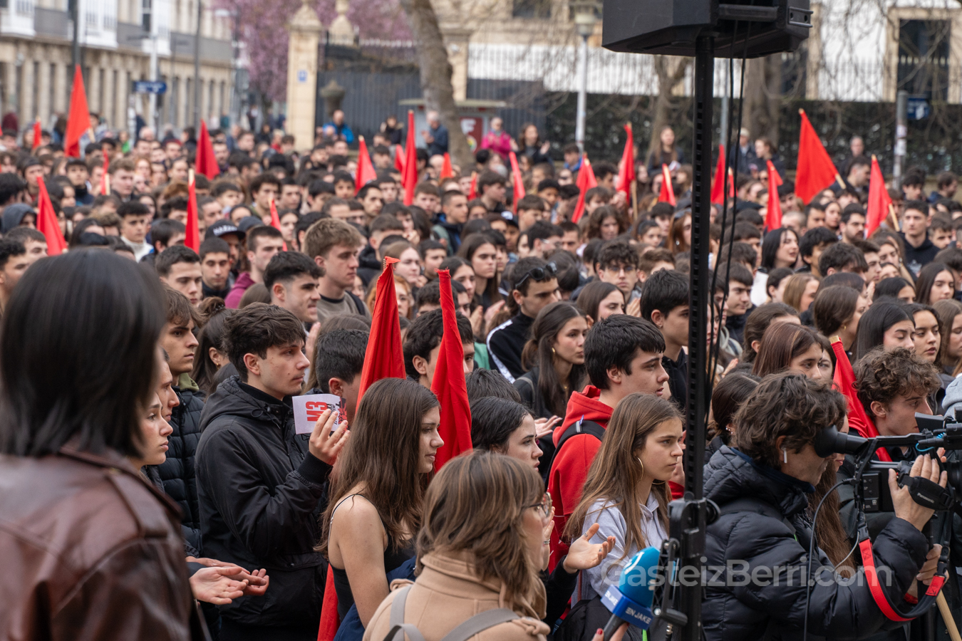 El acto institucional de Gogora en Villa Suso ha reunido a las principales autoridades, mientras que cientos de estudiantes han tomado las calles del centro en las marchas convocadas por GKS, IAS e Ikama, que han transcurrido sin incidentes pese al fuerte dispositivo de seguridad desplegado por la Ertzaintza, con helicóptero y dron sobrevolando el centro de la ciudad.