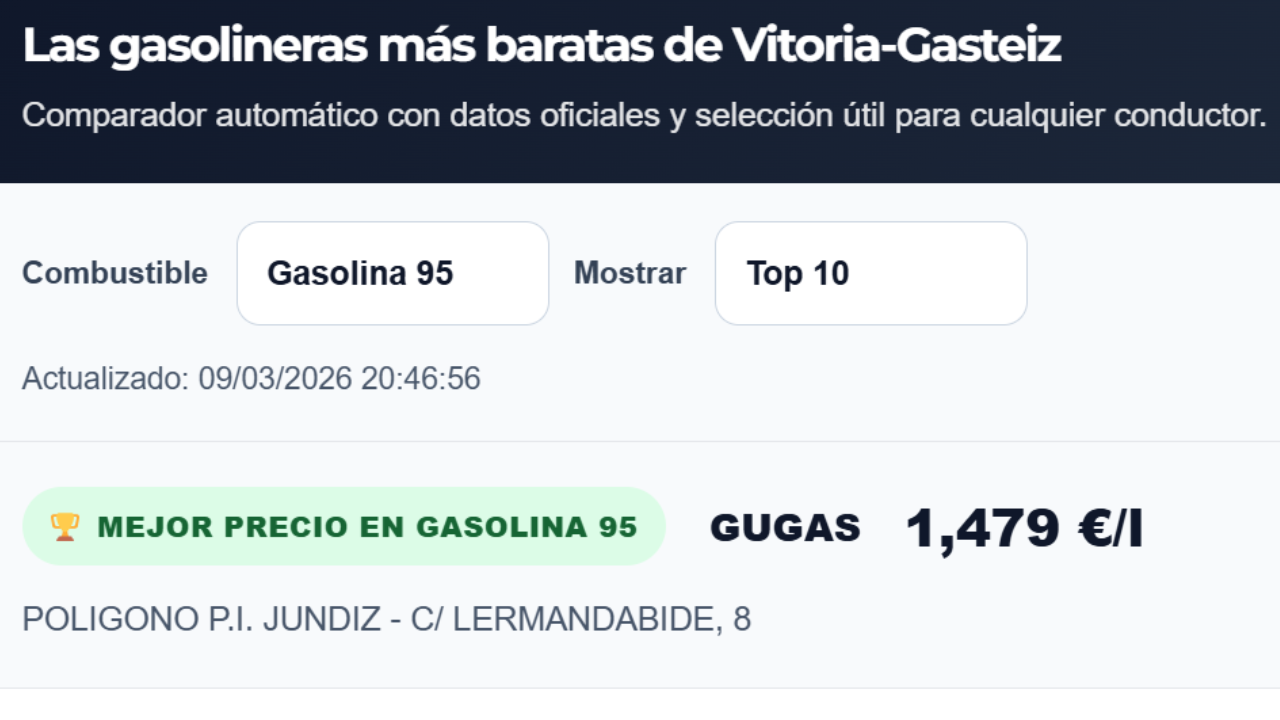 GasteizBerri ha puesto en marcha una nueva herramienta digital que permite consultar el precio del combustible de las diez gasolineras más baratas de Vitoria-Gasteiz en directo. El sistema muestra automáticamente cuánto cuesta repostar en cada estación de servicio de la ciudad y destaca las opciones más baratas.