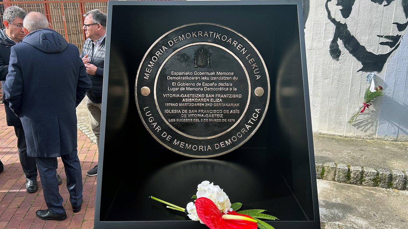 La iglesia de San Francisco de Asís, en el barrio de Zaramaga, ha recibido esta mañana la placa que la declara Lugar de Memoria Democrática, en el marco del 50 aniversario de los sucesos del 3 de marzo de 1976. El distintivo, entregado por el secretario de Estado de Memoria Democrática, Fernando Martínez, se instalará cuando concluyan las obras que se están llevando a cabo en el templo.