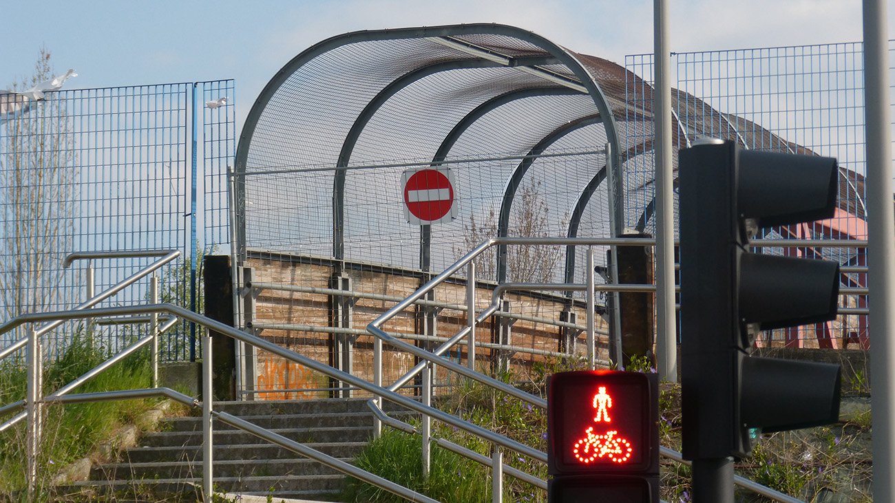 La pasarela de los Astrónomos conecta dos puntos habituales del barrio por encima de las vías del tren. Su cierre obliga ahora a quienes la usaban a buscar recorridos alternativos, con desvíos de entre 400 y 900 metros para cruzar de un lado a otro.