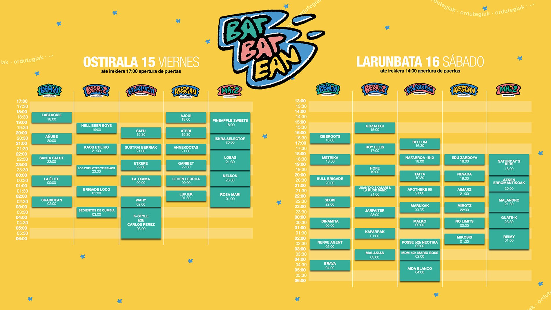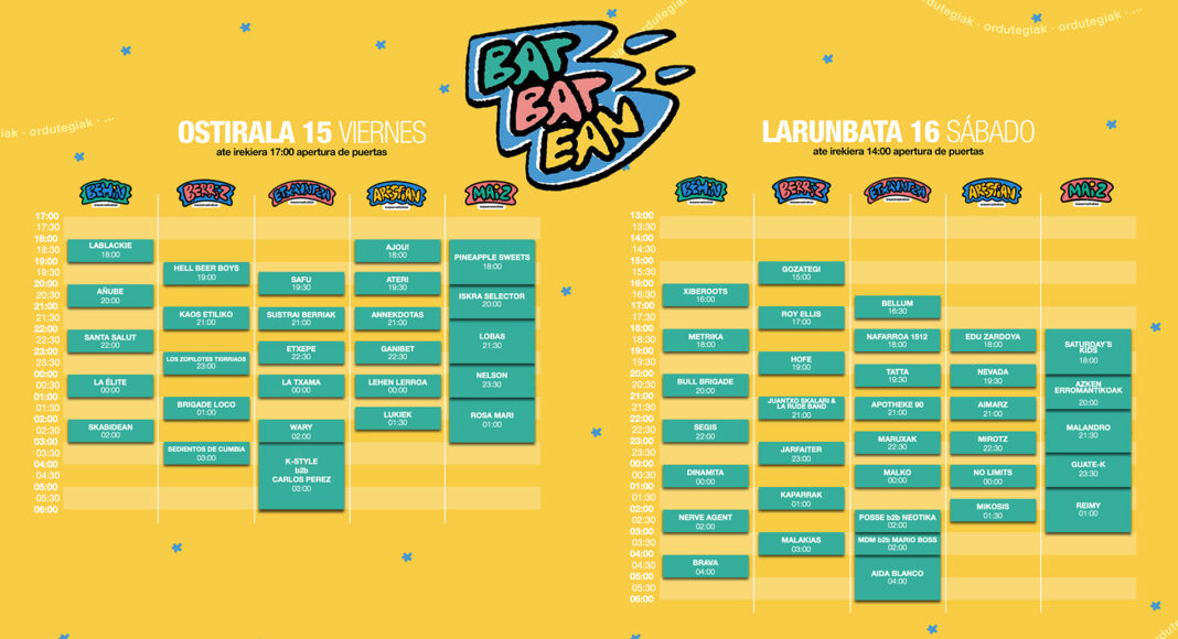 El cartel se reparte entre cinco escenarios, Behin, Berriz, Etxauntza, Arestian y Maiz, que funcionarán en paralelo. El viernes las puertas han quedado fijadas a las 17:00, y el sábado se adelantan hasta las 14:00.