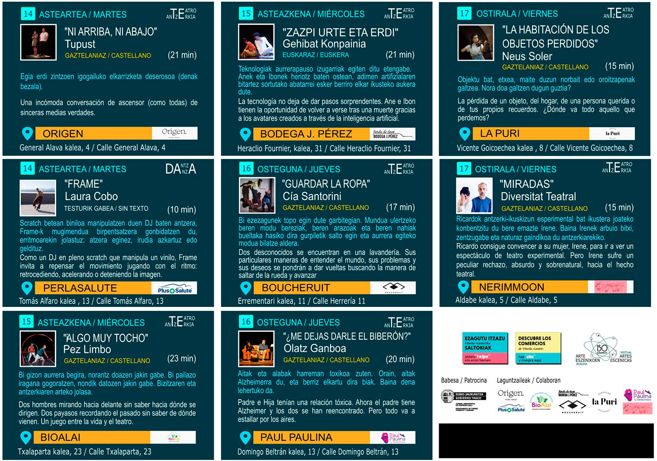 El público podrá ver las actuaciones en tres pases cada tarde, a las 18.00, 18.45 y 19.30 horas, en espacios comerciales repartidos por varios barrios de Gasteiz. El ciclo reúne siete obras de teatro y una pieza de danza.