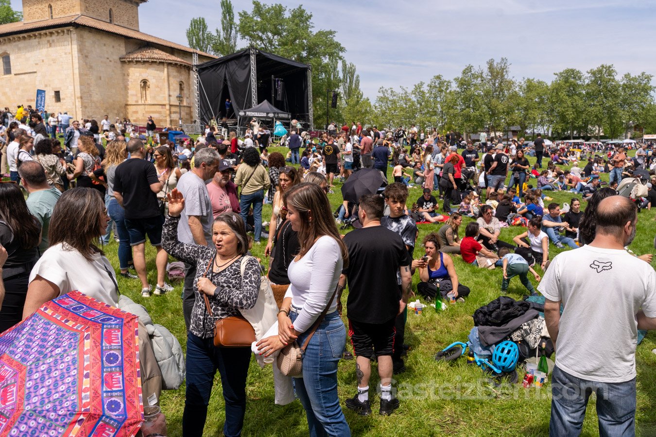 La campa ha sido, un año más, el gran punto de encuentro de la jornada. Desde la mañana, muchas personas han llegado andando desde diferentes barrios de Gasteiz para celebrar el día del patrón de Álava. La afluencia se mantenía constante a lo largo del mediodía, con grupos repartidos por toda la pradera, niños correteando con dinosaurios hinchables, cochecitos abriéndose paso entre las mantas y cuadrillas paseando en busca de un hueco donde sentarse.